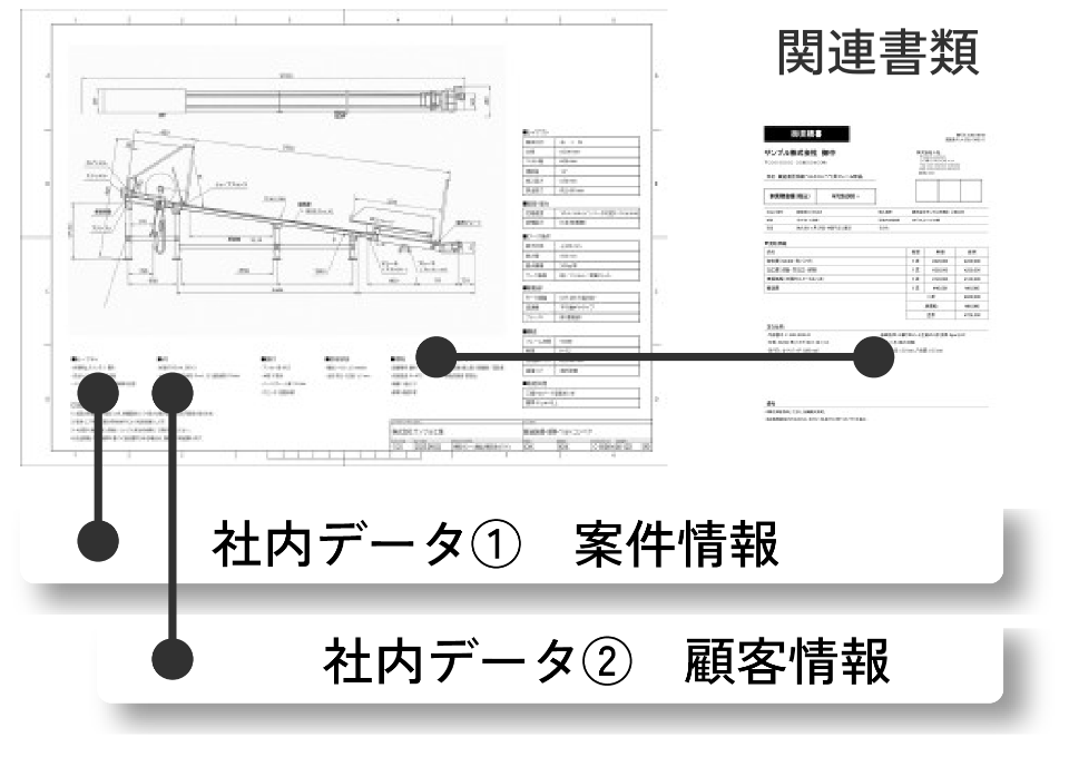 見積書・仕様書・検査成績書などの関連書類、さらに基幹システムのデータを自動で紐付け