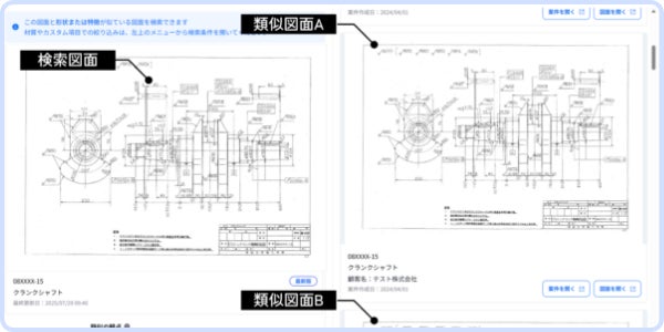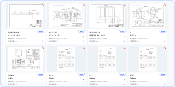 図面の形状・寸法・材質などを元に、類似データを自動抽出。図番が違っていても5秒で見つかる