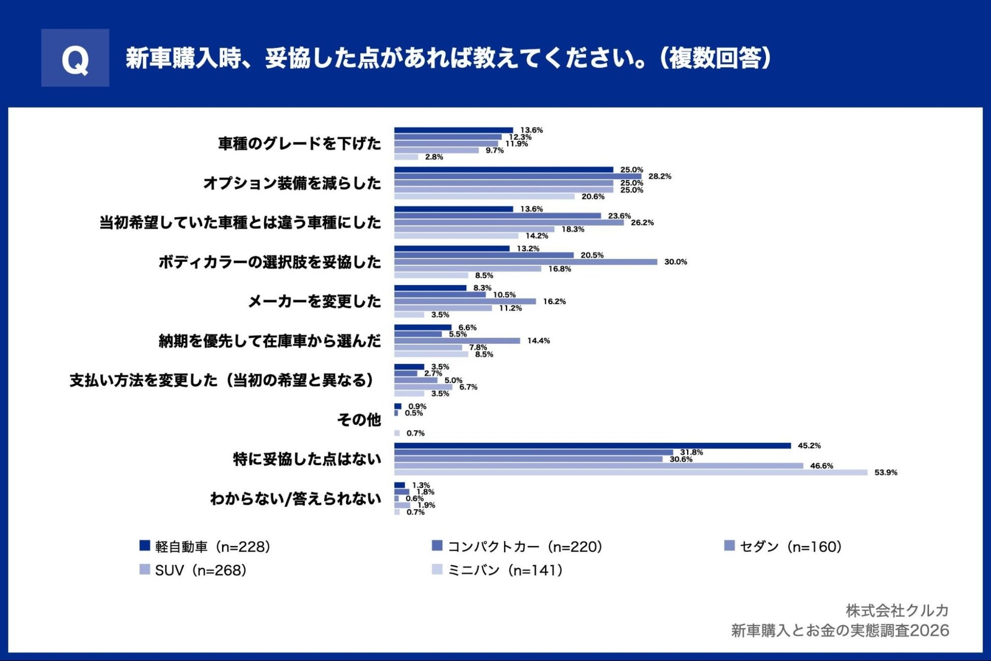 02|新車購入時の妥協点、セダンは「ボディカラーの選択」が30.0%でトップ 最小のミニバン層と比較して3.5倍以上の回答率に
