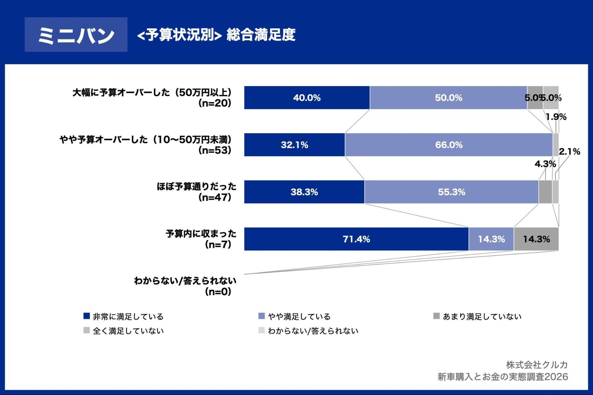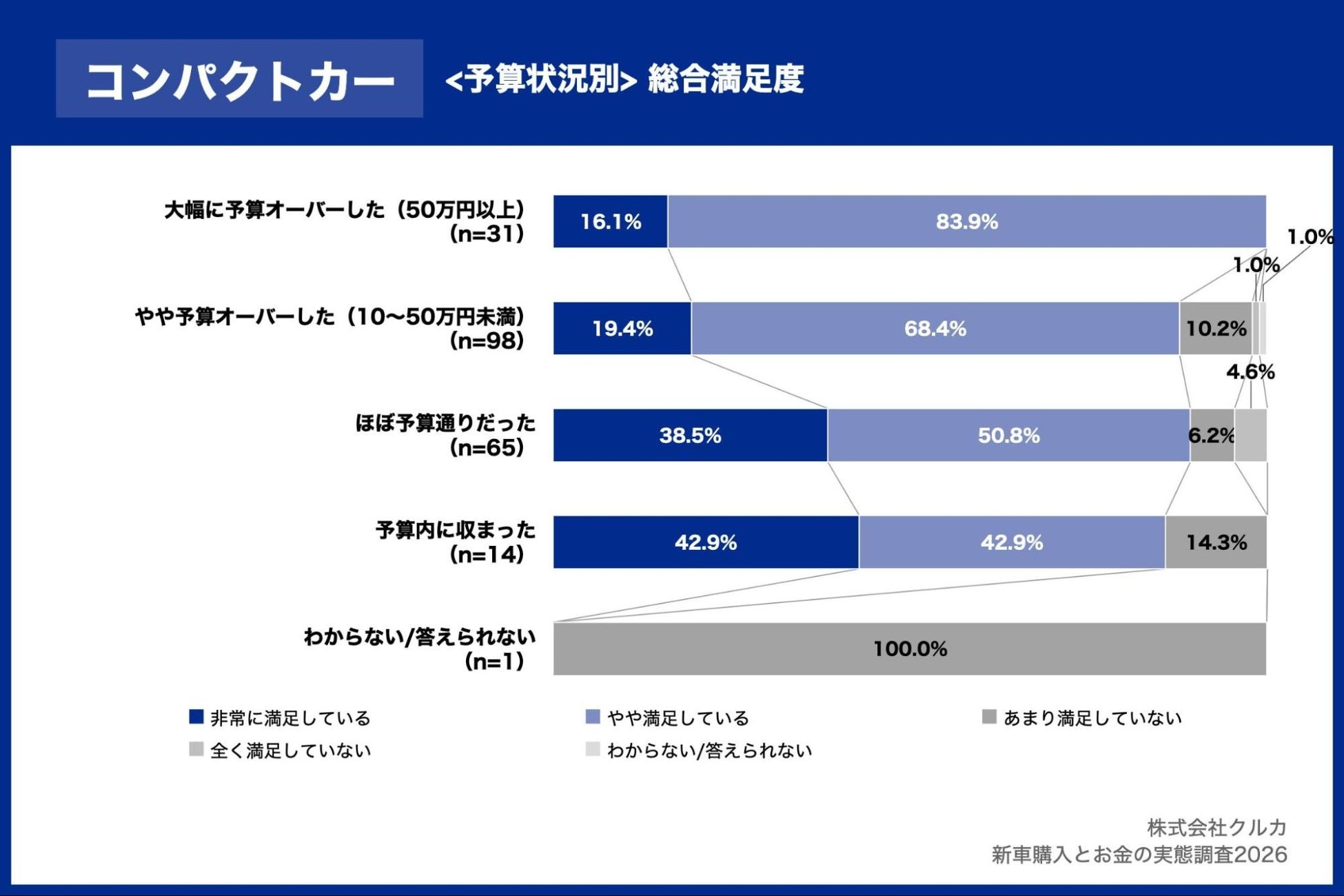 03|予算状況別の満足度、大幅な予算オーバーを経験した層でも満足度は高く、コンパクトカーでは100%が満足と回答