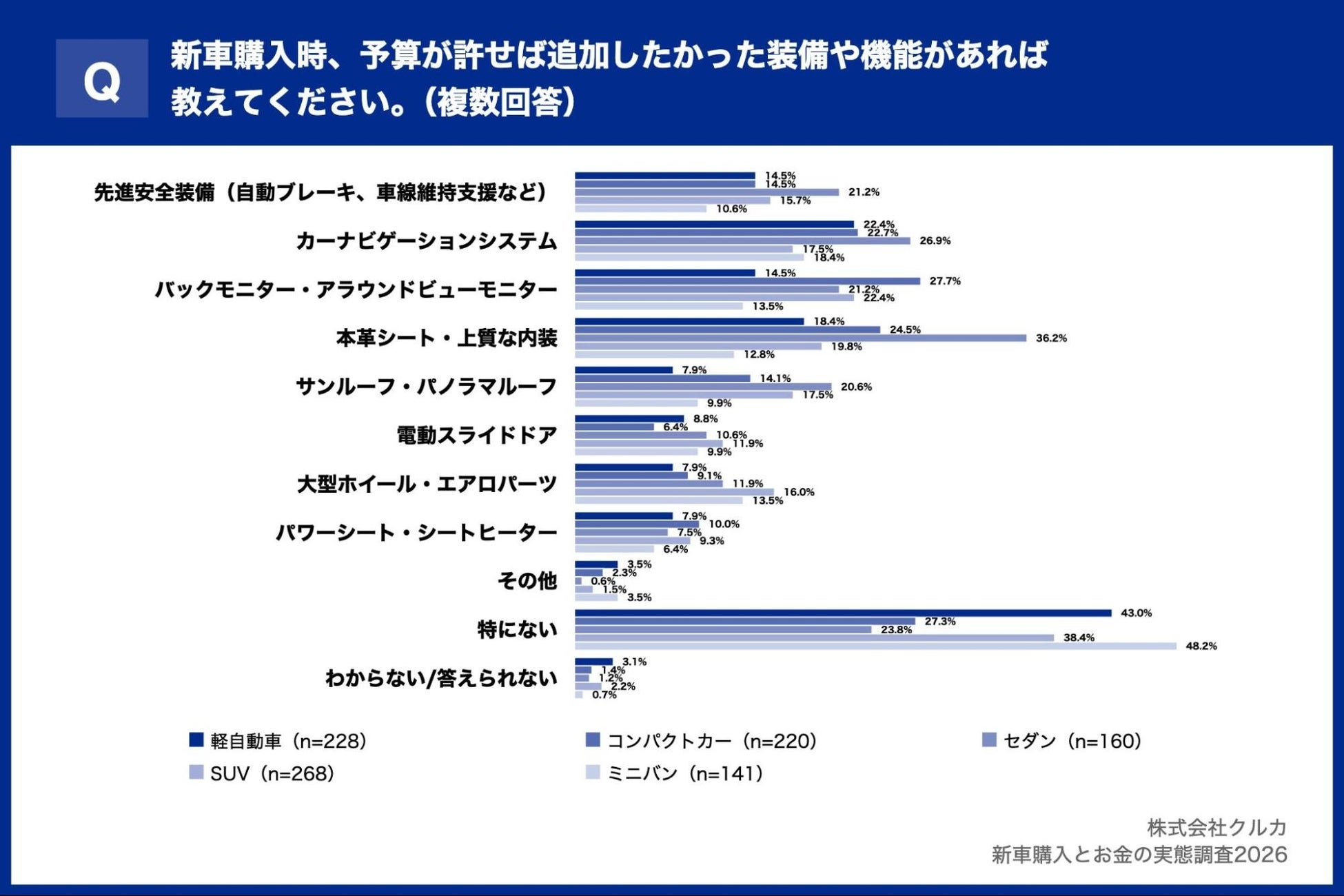 一方、ミニバン層では「特にない(48.2%)」が最多となり、実用性を重視するカテゴリでは現在の装備で既に完結している傾向が見られました。