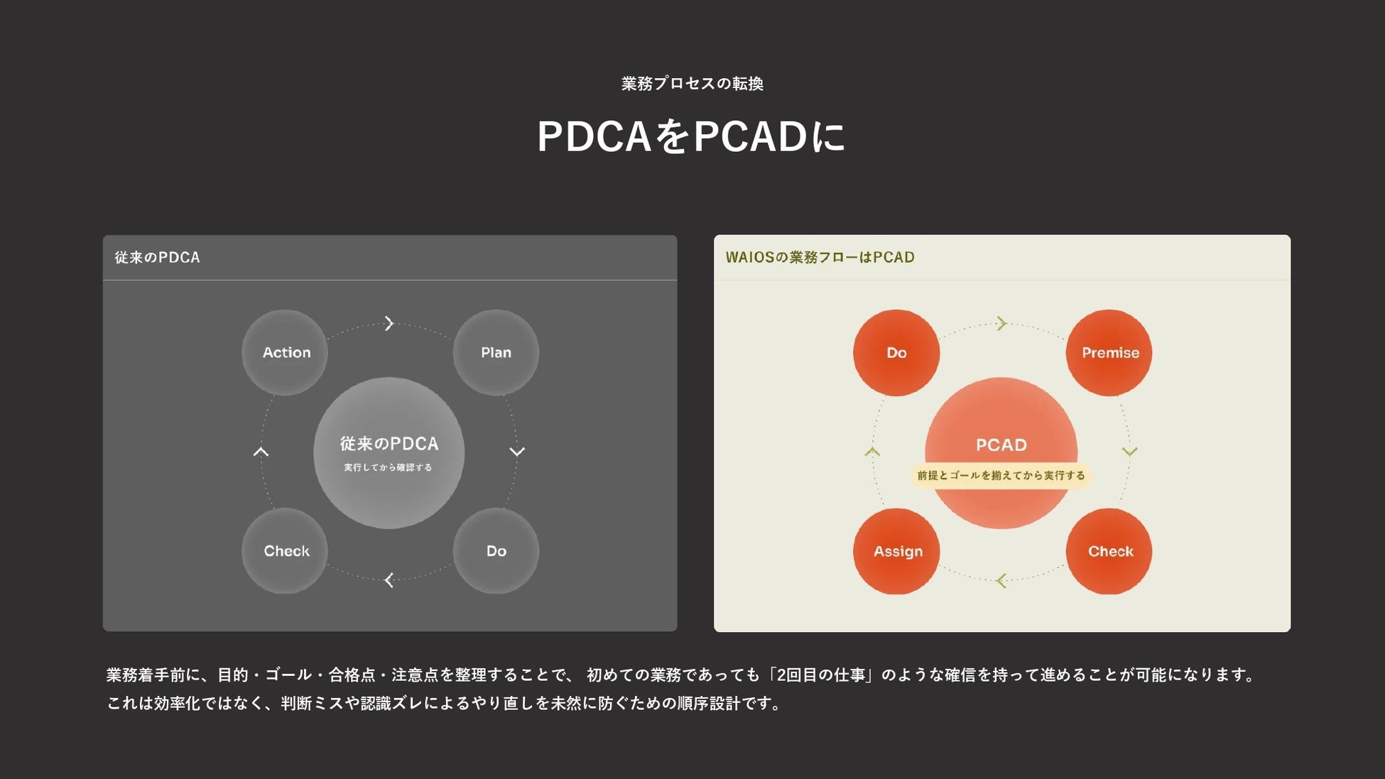WAIOSは、従来のPDCAとは異なる「PCAD」により、Do(実行)の前に“業務内容を整える”ことに焦点を当て、無駄な労働が増える原因を実行前に整える設計を採用しました。