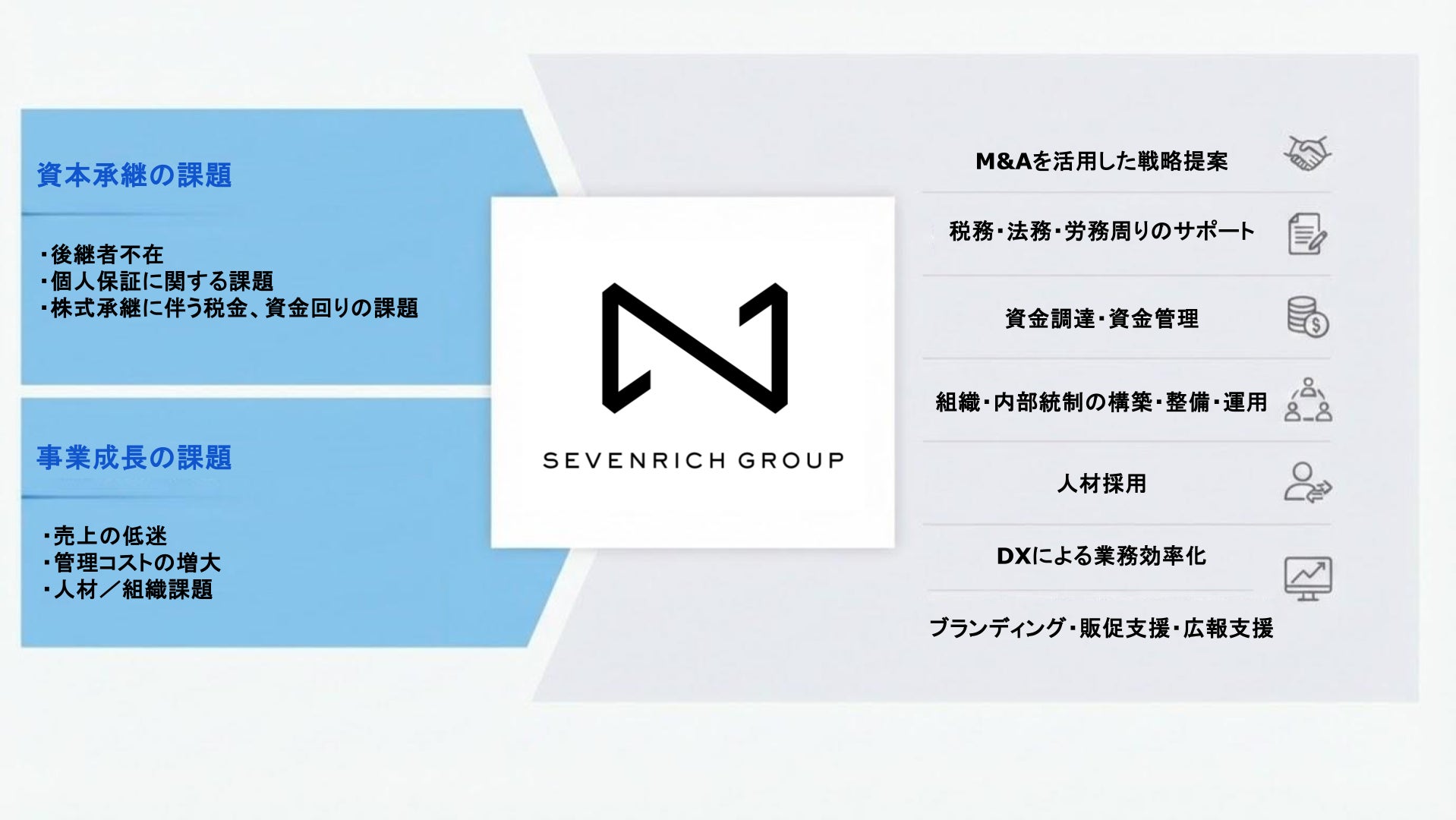 さらに、SEVENRICH GROUPが持つ会計・税務をはじめとしたバックオフィス機能やグループネットワークも活用しながら、企業の持続的な成長を支援していきます。