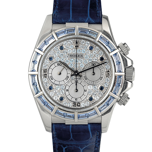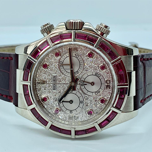 デイトナ(16559SACO)はベゼルに加えてラグにも宝飾が施された仕様が特徴で、デザイン性と希少性が強く価格に反映されやすいモデルです。