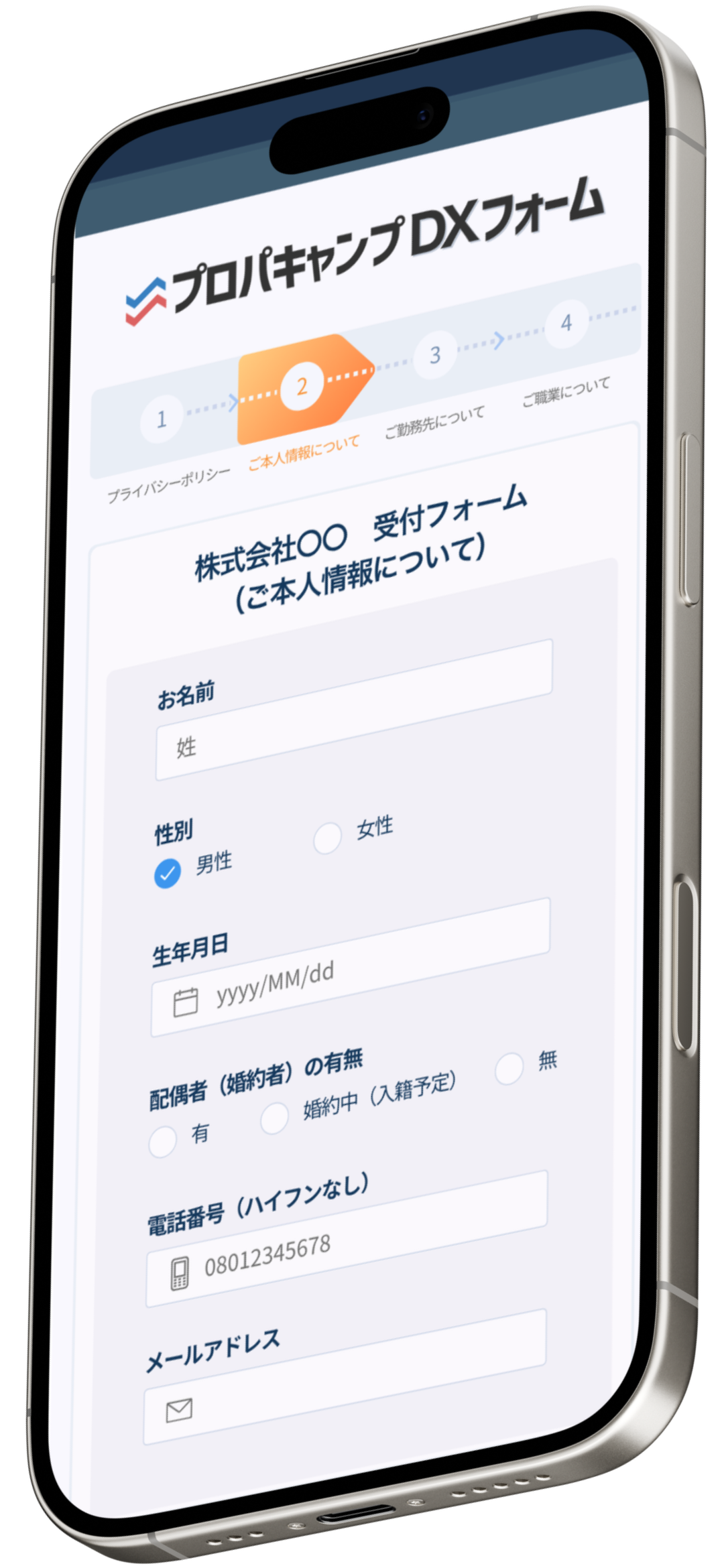 借入状況や健康状態など、対面では聞きづらい内容も、お客様自身のスマートフォン入力により自然な流れで回収できます。営業担当者の心理的負担を軽減しながら、重要情報の取得精度を高めます。 -