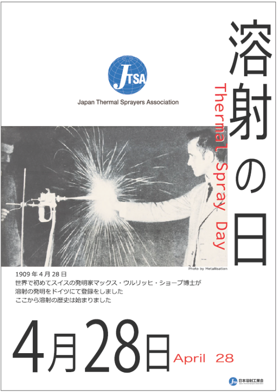 4月28日は、溶射の父であるスイスの発明家マックス・ウルリッヒ・ショープ博士が世界で初めて溶射の発明 (金属溶射プロセスの基本特許)をドイツにて登録した1909年4月28日に由来します。