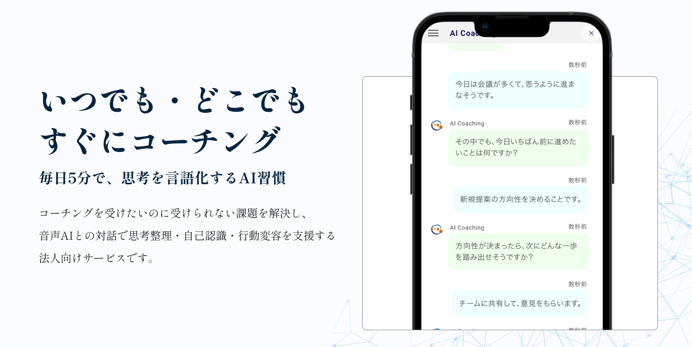 今すぐ自分の考えを整理し、目的や目標を言語化できる、法人向けにAIでコーチングを受けられる、毎日5分の新習慣です。音声AIとの対話を通じて、クイックに思考を整理し、自己認識を高め、行動変容へとつなげます。