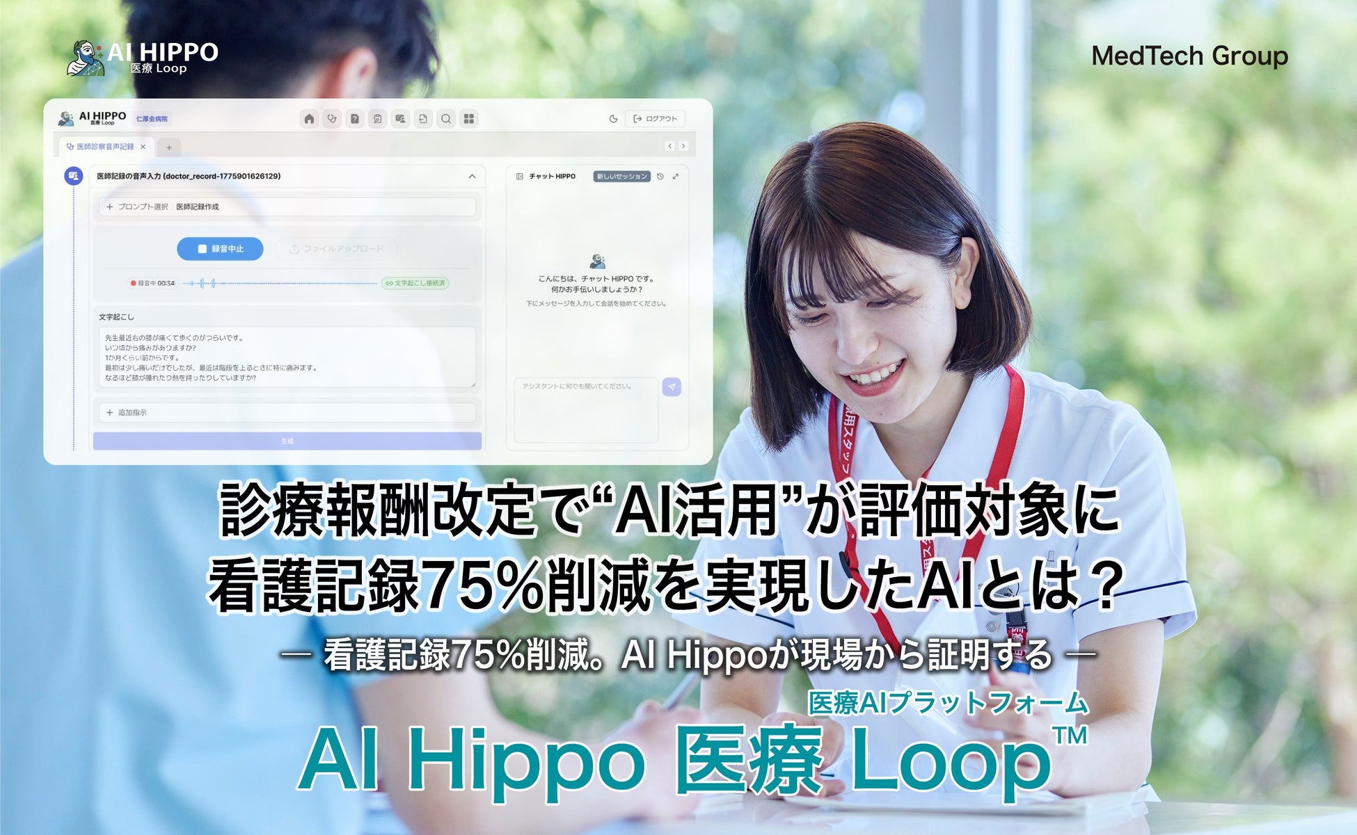 医療AIと病院AI PMOカンパニー、MedTech Group株式会社(本社:東京都港区、代表取締役社長 前田清貴、以下MedTech G社)と企業データとAIの利活用カンパニー、AIデータ株式会社(本社:東京都港区、代表取締役社長 佐々木隆仁、以下AIデータ社)は、医療現場における意思決定支援を目的とした新たなAI機能「医療Loop(Medical Loop)」 を搭載したAIプラットフォーム 「AI Hippo」において、医師診察音声記録および看護音声経時記録機能の提供を開始しました。