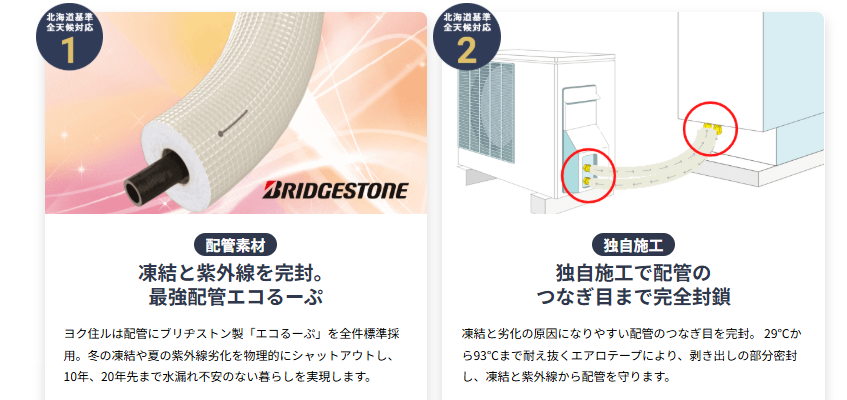 最高クラスの耐熱・耐久性を誇る配管「エコるーぷ」を全工事に採用。さらに、日本トップクラスの快晴日数を誇る埼玉の強烈な紫外線から配管を守るため、耐候性に優れた特殊素材「エアロテープ」で鉄壁のガードを施します。