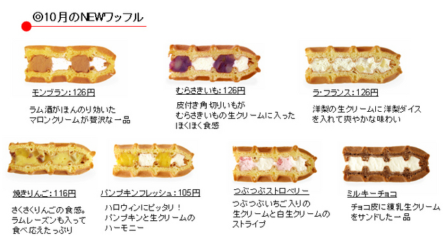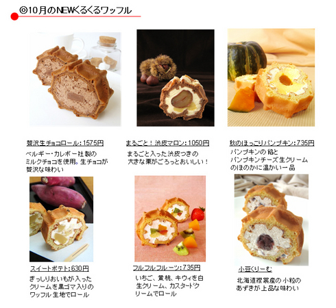 10月は、まるごと1個贅沢な栗入り、かぼちゃ、さつまいもなどの素材そのままのおいしさを生かしたくるくるワッフルが登場。
