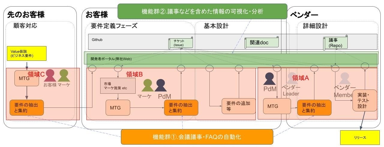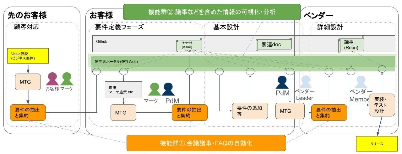 機能群①の「議事録の自動生成」「議事録の分析」を通じて、機能群②ではコミュニケーション状況を可視化・分析し、企業担当者と開発ベンダー(ビジネスサイドと技術サイド)が共に改善に利用することで、開発生産性の向上を図ります。