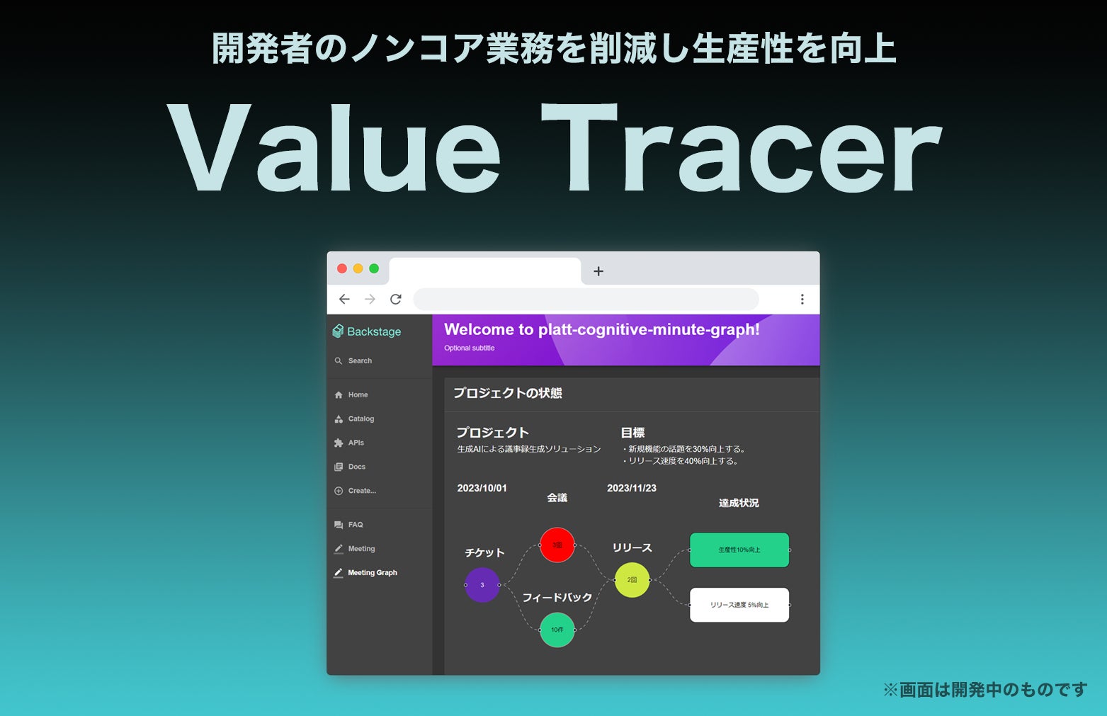 「Value Tracer」は、開発者自身が必要とするツールや情報などを簡単に見つけて利用することができる「開発者ポータル」であるBackstage(バックステージ)のプラグイン(※)として、AIを組み込んだ国内初の事例となります(当社調べ)。