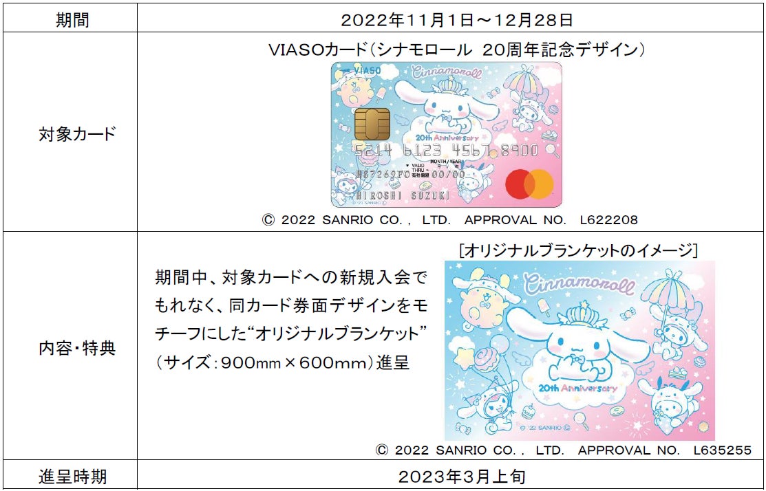 「VIASOカード(シナモロール 20周年記念デザイン)」は、サンリオの人気キャラクター“シナモロール”のデビュー20周年を記念して2022年3月1日から12月28日までの期間限定で会員を募集しているオリジナルデザインのクレジットカード(2022年3月1日プレスリリースご参照)。当社は本キャンペーンを機に、同カードの新規入会に一段と弾みをつけ、シナモロールのデビュー20周年の締めくくりを一層盛り上げたいと考えているものです。