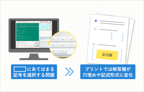 - 画面上で選択問題のものを、プリントでは穴埋め問題・記述問題などに変化させる
