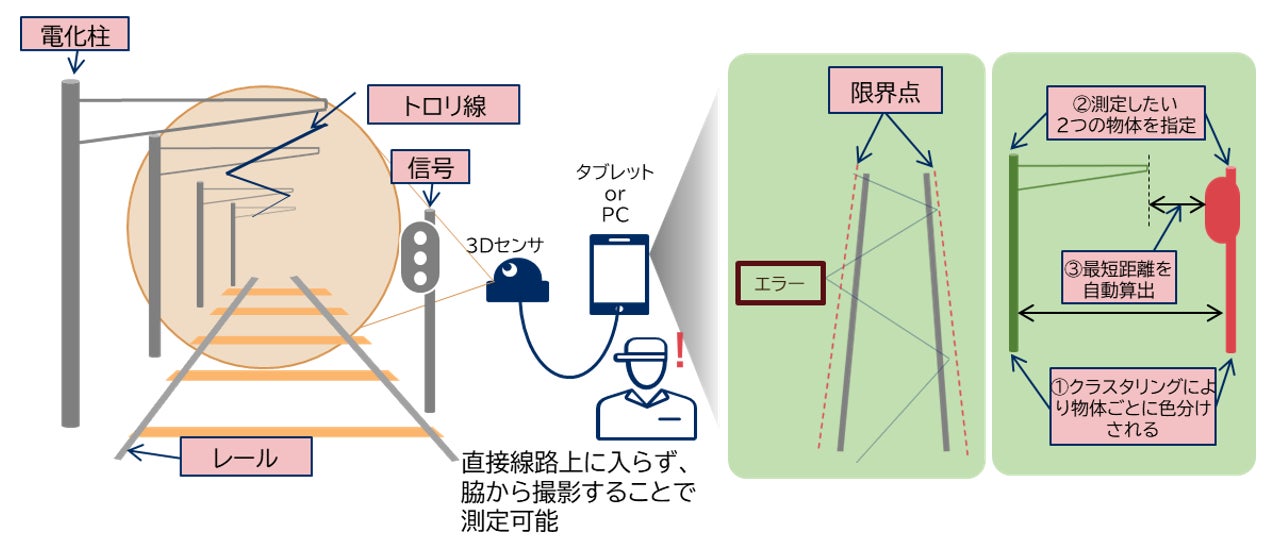 NEC 3次元測量支援ソフトウェアは、離れた場所から点検対象の設備を撮影し、撮影したデータで離隔距離や傾きなど測定することができるソフトウェアです。トロリ線や電化柱など高い場所にある設備点検作業の際に線路に入らずに線路脇などの離れた場所から撮影することで計測ができますので、点検作業の効率化・作業員の安全確保に役立ちます。使用する機材は、3Dセンサとタブレットと持ち運び可能な機材のため、作業員一人でも計測作業が行えます。