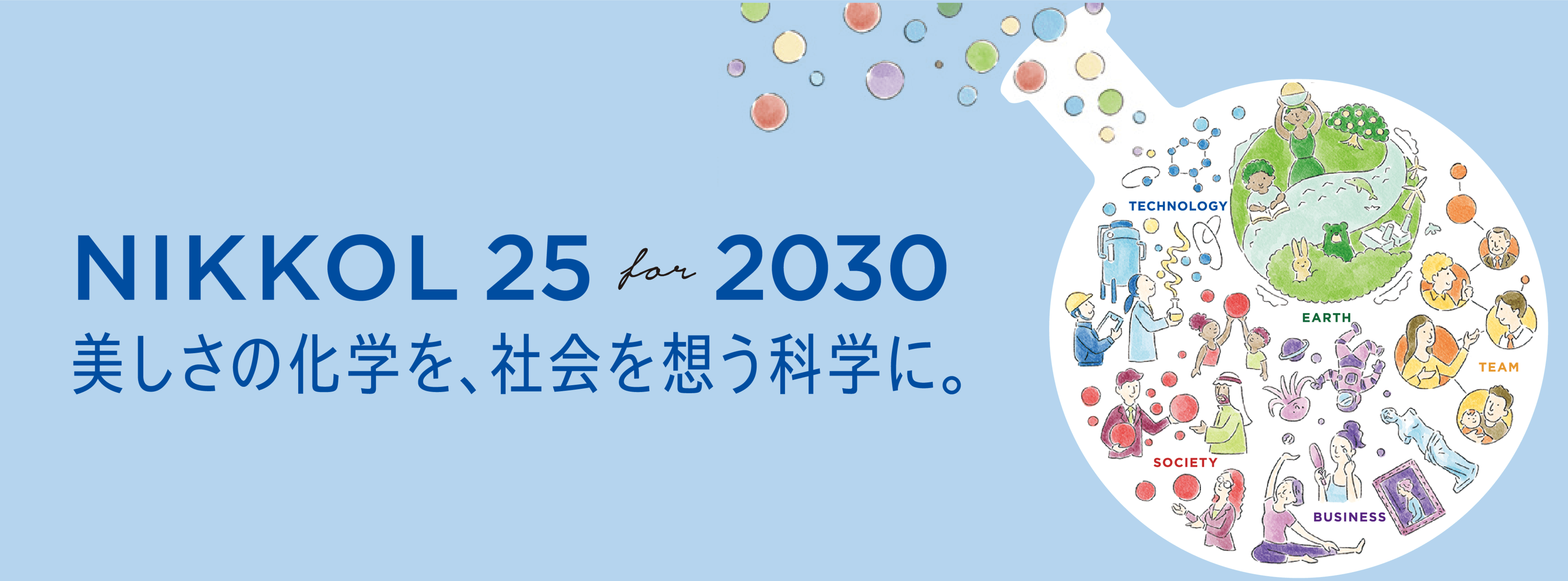 2020年4月には、新ビジョン「NIKKOL 25 for 2030〜美しさの化学を、社会を想う科学に。〜」を設計し、社員の25の夢を達成させることによりさらなる持続可能な事業展開、社会貢献を目指します。また、新たな価値の創造ため、新体制に事業部制を取り入れ、また中央研究所を設置することで、よりスピーディーにお客様のご要望に応えてまいります。