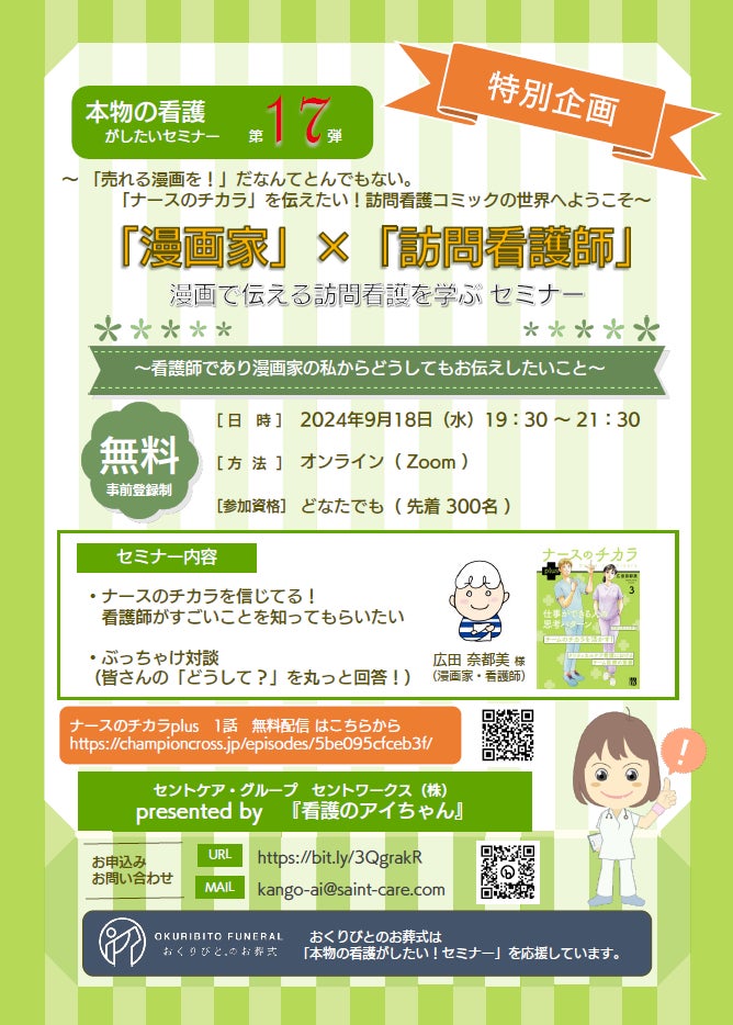 セントワークス(株)は9月18日、オンラインにて「漫画で伝える訪問看護を学ぶセミナー」を開催。「おうちで死にたい」「ナースのチカラ」著者である広田 奈都美氏を迎え、訪問看護の魅力や意義について考える。