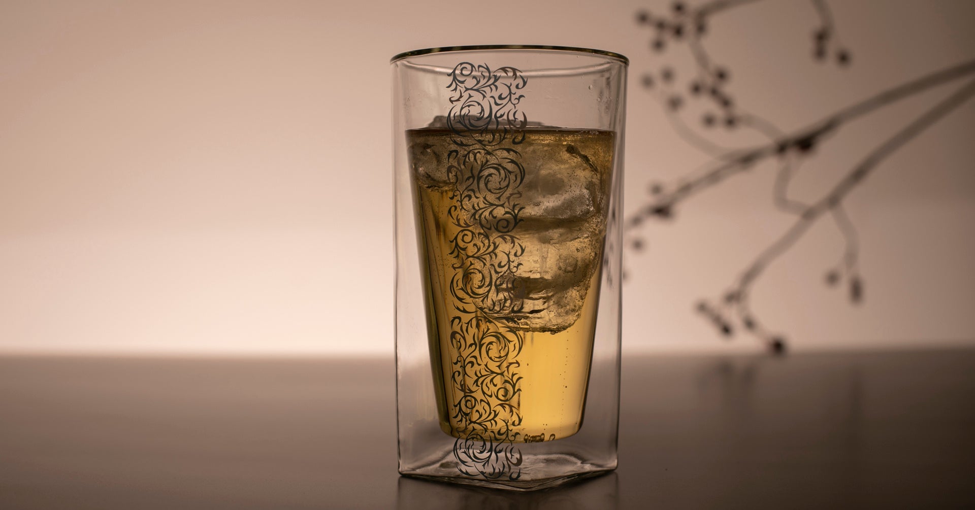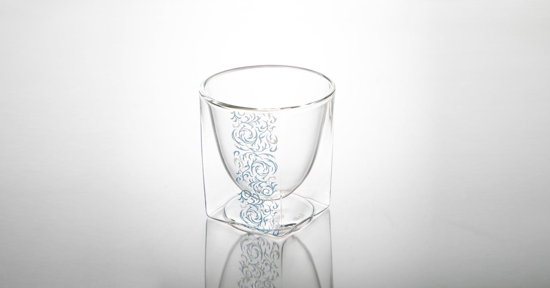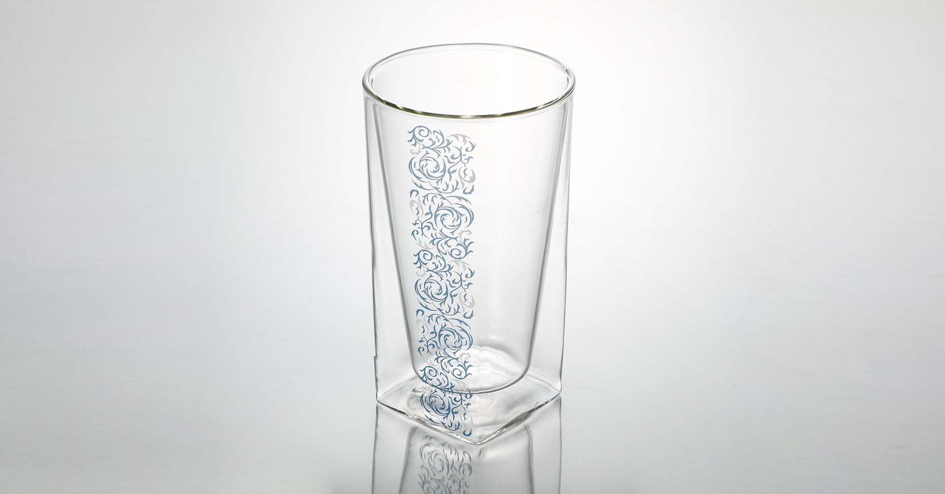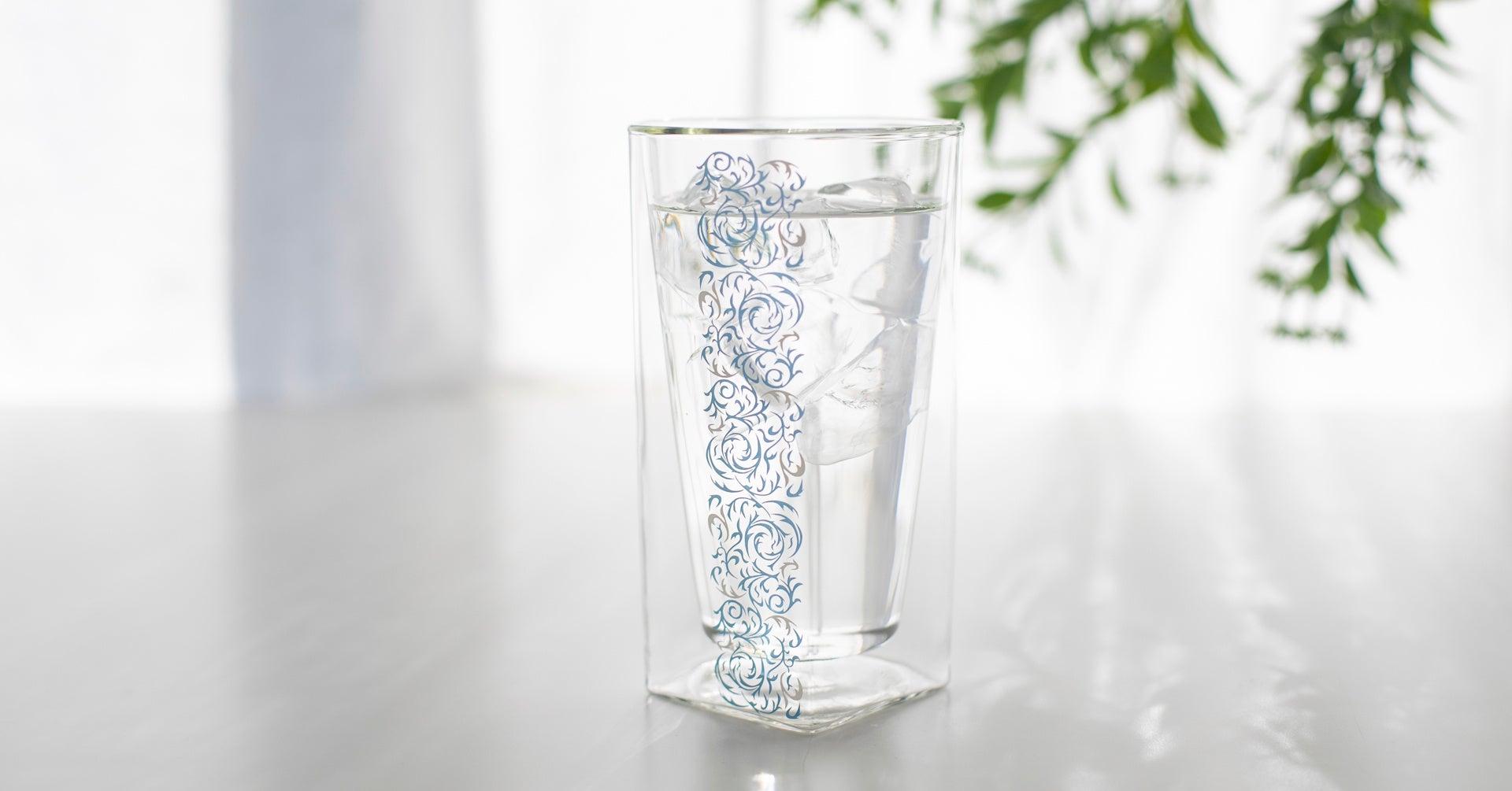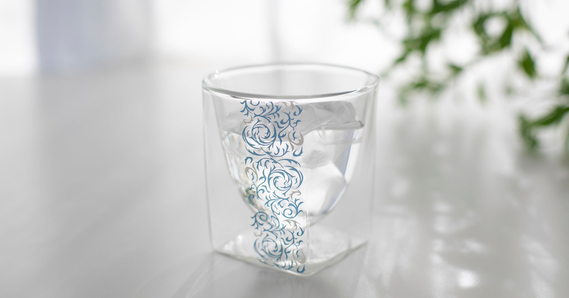 従来のダブルウォールグラスに柄や模様を刻印し、飲料を注ぐと、柄や模様はより一層映え、視覚で楽しんでいただけると考え、墨絵や唐草模様のアート性のあるデザインを企画しました。
