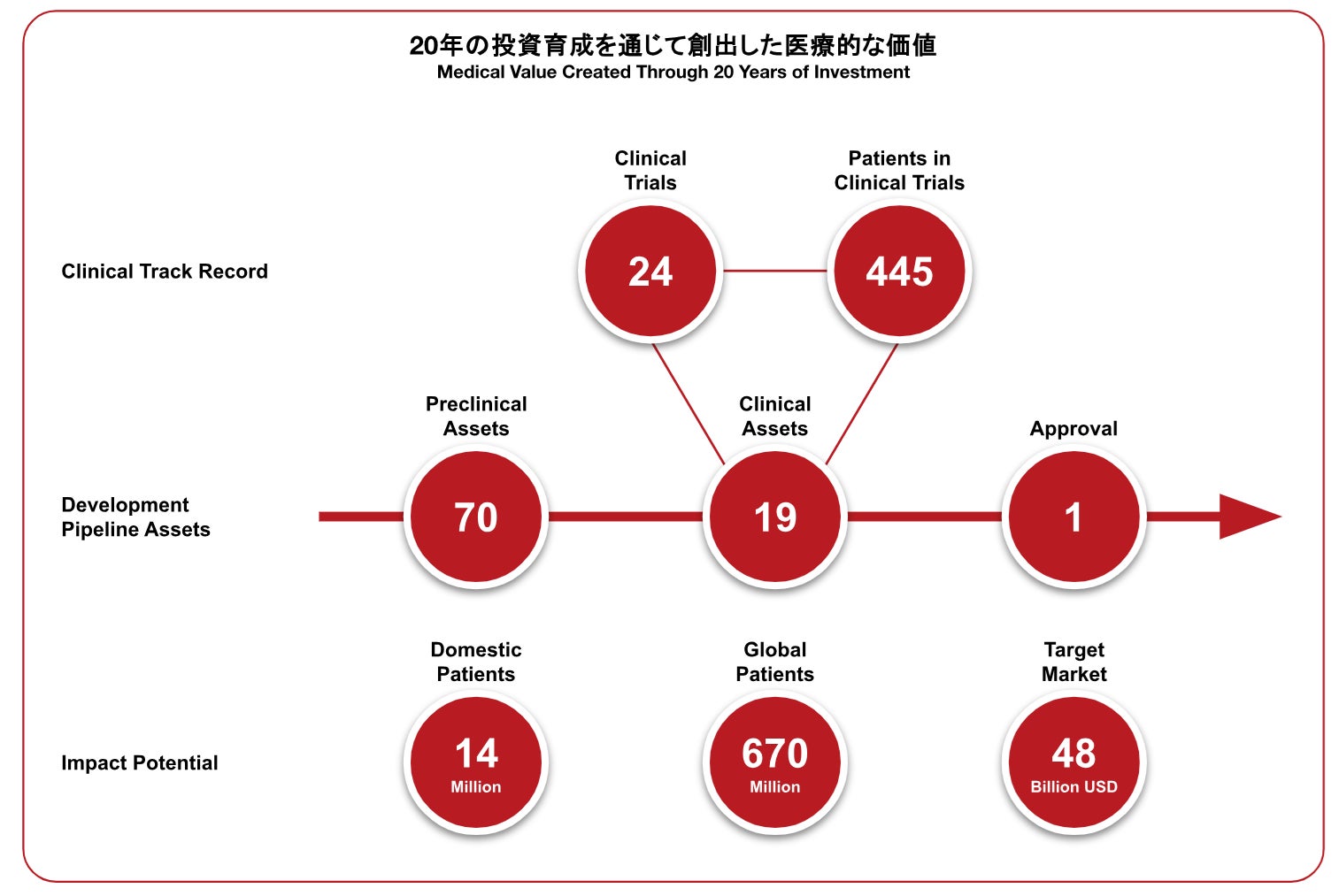 投資先が開発を進める製品のパイプラインは、非臨床ステージが70、臨床ステージが19、薬事承認を得たものが1製品です。これまでに24の臨床試験を行い、445名の患者さんに新たな治療薬候補を届けてきました。