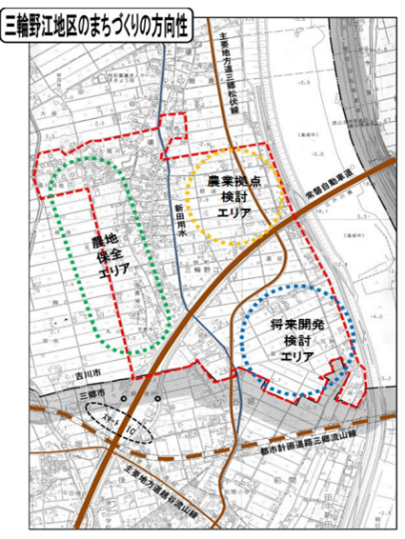 三輪野江地区は、交通アクセスのよさと農地の面的なまとまりという2点が最大の特長です。今後の地権者協議や企業誘致の状況によって変化しますが、順調に開発が進めば、本市における新たな農業の拠点となる可能性を秘めています。