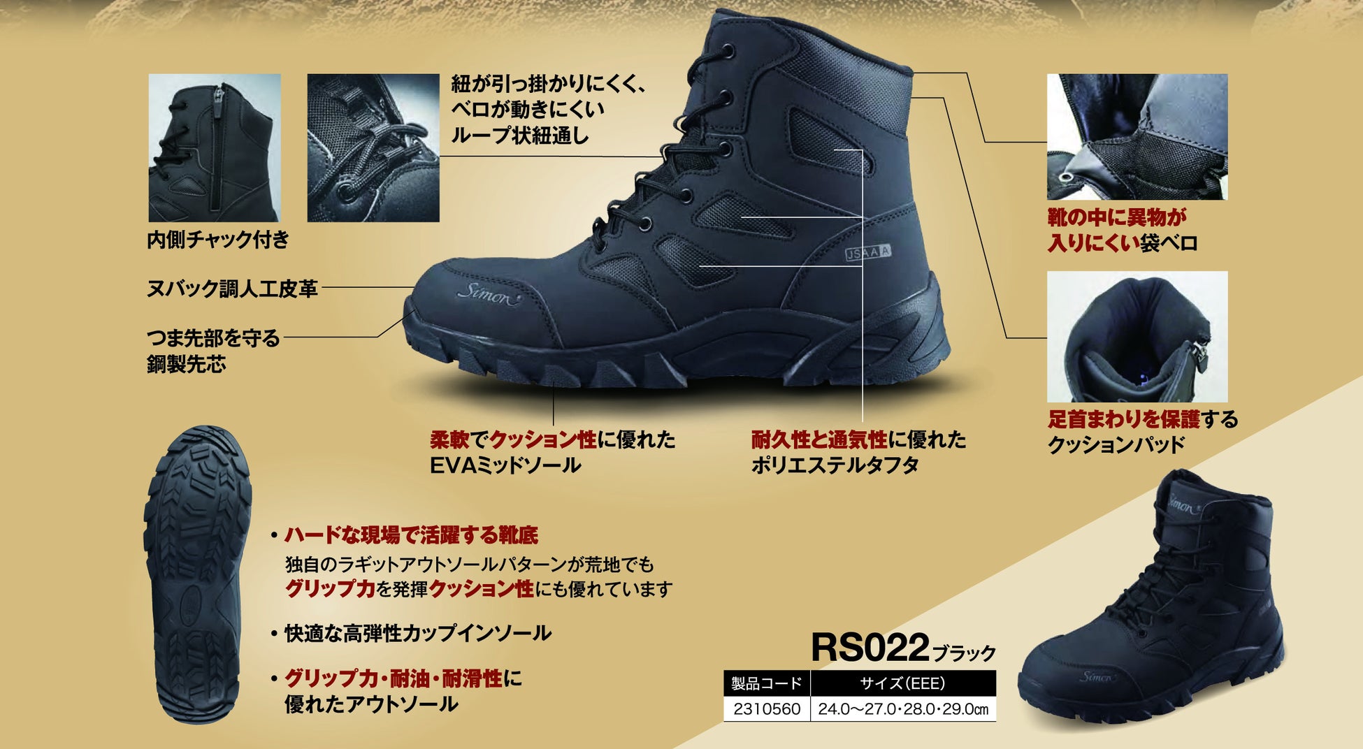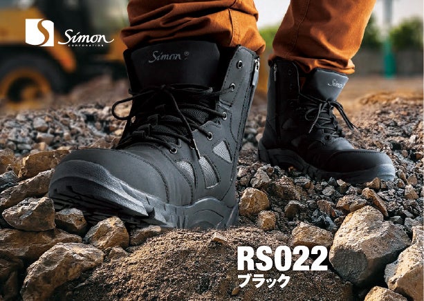 株式会社シモン(本社:東京都中央区 代表取締役:利岡和範)は2025年6月にプロテクティブスニーカー※RSシリーズの新モデル「RS022ブラック」を発売します。RSシリーズはJSAA規格認定の安全性・耐滑性・耐油性が評価され多くのユーザー様に支持されており、建築土木作業用のみならずさまざまな現場で広く使用されています。「RS022ブラック」は足首周りを保護するクッションパッド、通気性と耐久性に優れたポリエステルタフタのアッパーを採用。異物が入りにくい袋ベロなど現場の「欲しい」を形にしました。