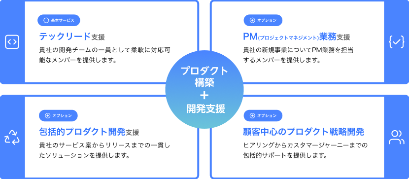 Prolaunchでは、ビジネス要求のプロダクト設計、UXへの落とし込み、PM業務から開発〜リリースまでの一貫した業務を弊社開発チームで実施すると同時に、社内で自走する開発運用体制構築のための以下のようなサポートを行います。