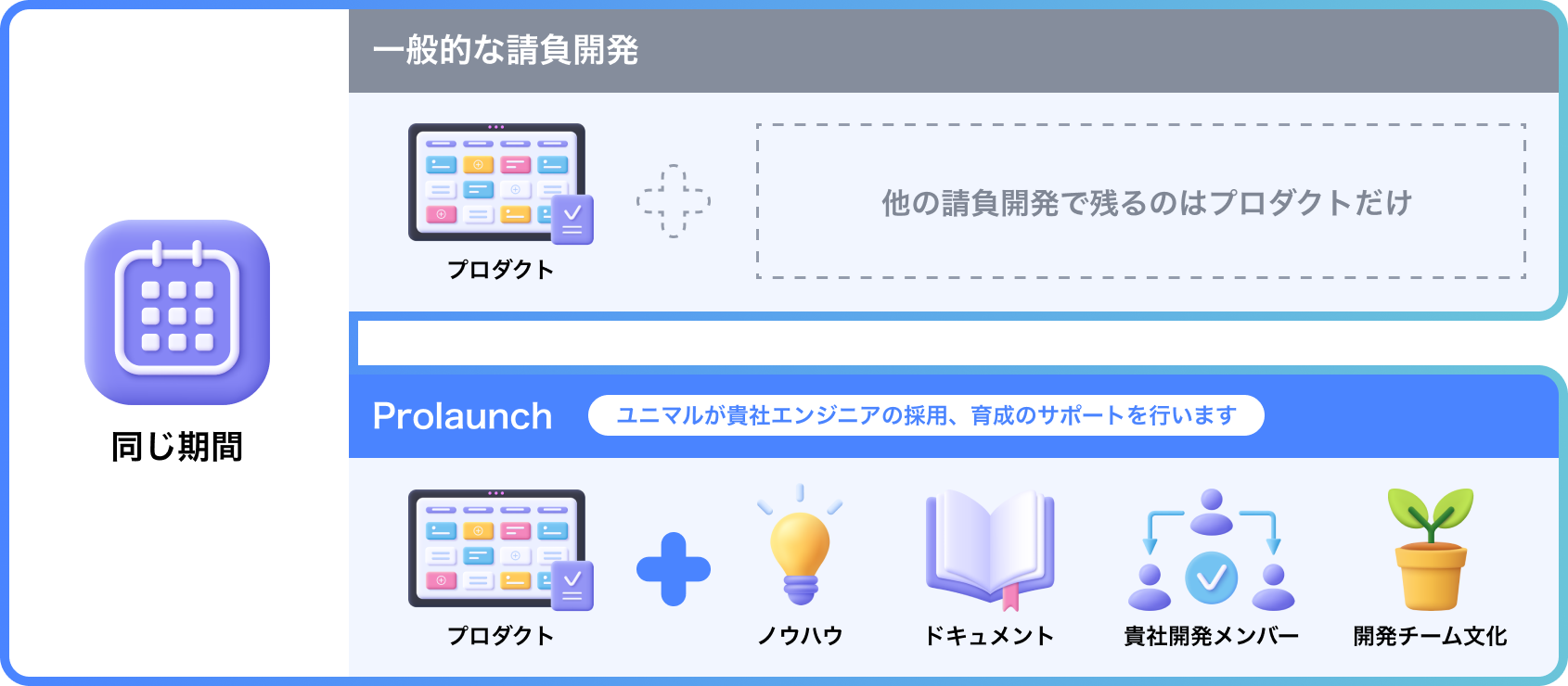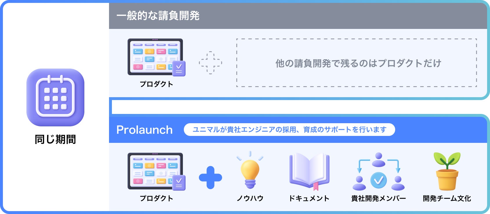 Prolaunchを運営するユニマルは、自社サービスを運営しつつ多くのクライアントの開発支援を行ってきました。様々な状況、開発スタイル、課題に柔軟に対応して、高い評価を頂いているユニマルだからこそ、あらゆるクライアントの持っている課題に対応可能です。