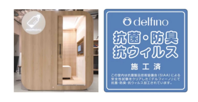 今回、相鉄ジョイナスと相鉄ライフ三ツ境には「デルフィーノ」抗菌加工を施した「mamaro®」を導入。「デルフィーノ」とは、㈱デルフィーノケア(本社:東京都目黒区、社長・宮本 貴司)が展開する感染予防対策製品です。専用の噴霧機によって室内に抗菌剤を充満させる施工方法で、ドアノブ・スイッチ類など手に触れやすい箇所だけでなく、床や壁、天井まで抗菌コーティングするため、感染リスクの軽減が期待できます。この加工を施した完全個室の「mamaro®」で、子育て世代のお客さまには快適に不安なく、授乳やおむつ替えなどをしていただけます。