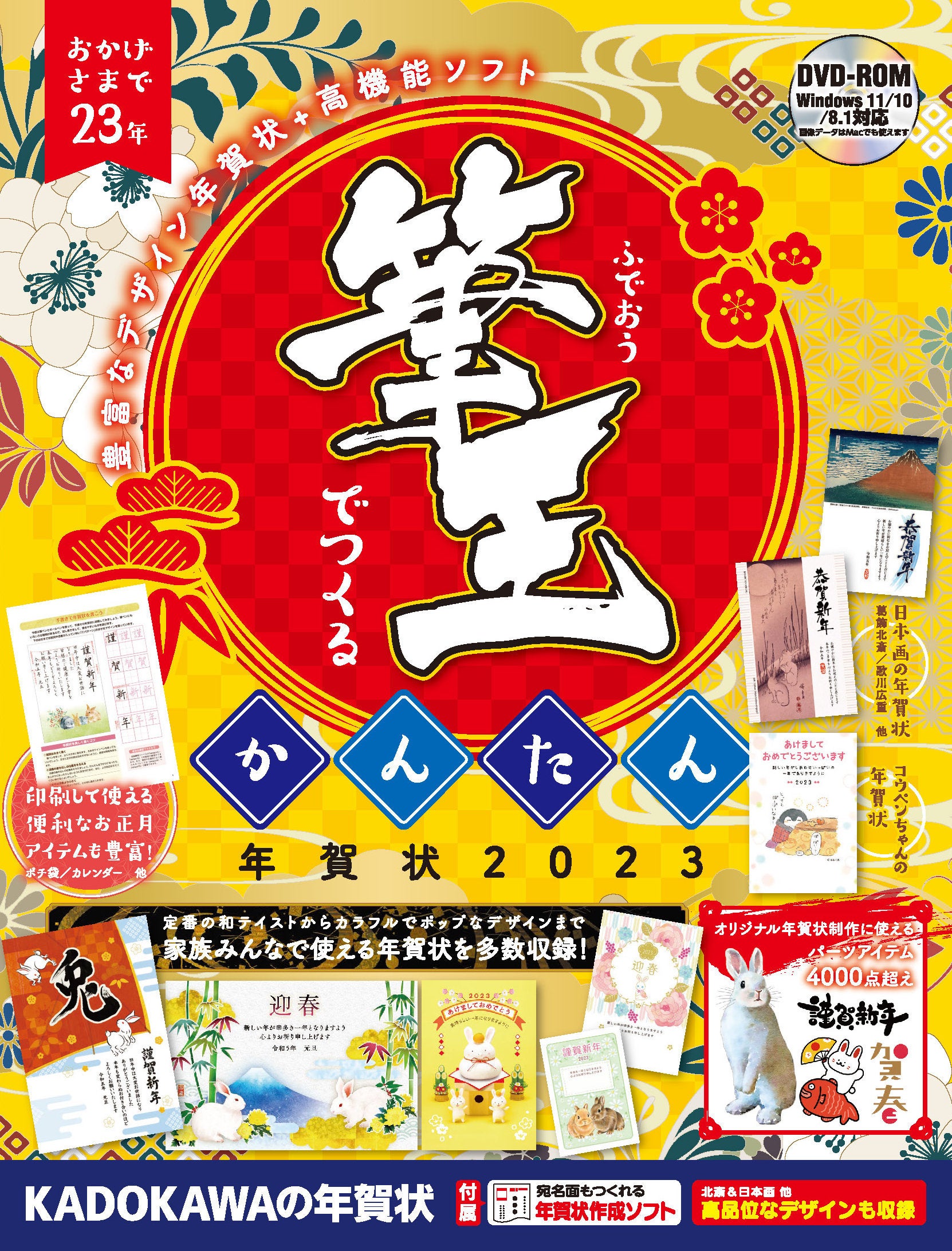 老舗の年賀状作成ソフト「筆王」付属!「歌川広重」「歌川芳藤」「葛飾北斎」など美麗な日本画デザインや、重厚な筆文字デザインに加え、おしゃれなデザインも豊富に収録しています。