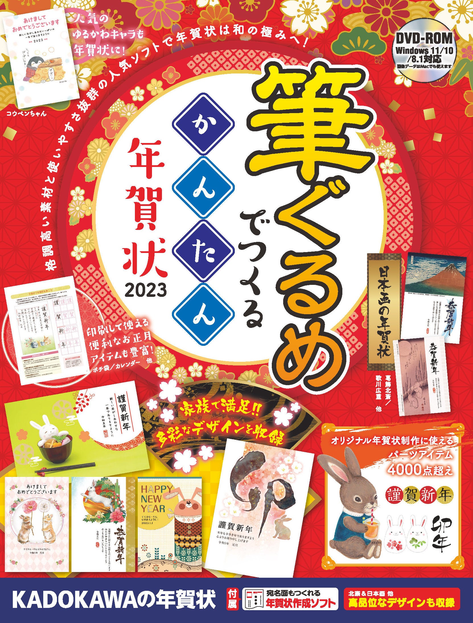 来年の干支「うさぎ」を墨絵風や切り絵風、和菓子風など多彩なタッチで人気作家が描く「特選作家年賀状」をはじめ、全国各地の日本酒のラベルをモチーフにした「全国日本酒」、歌川広重や葛飾北斎などの「伝統絵画」など、幅広い世代が使いやすいデザインを取りそろえました。はがき作成ソフト「筆結び2023」が付属。