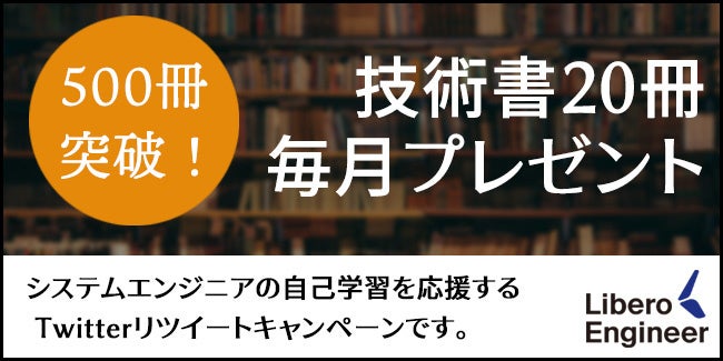 システムエンジニアの自己学習を応援する、技術書のプレゼントキャンペーンです。本キャンペーンはリベロエンジニア代表のtwitterアカウント、“金子 周平┃技術書配りおじさん“(@skaneko414)の「エンジニアの自己学習を応援」投稿をリツイートいただいた方の中から抽選で、20名さまにお好きな技術書が当たるキャンペーンとなっております。
