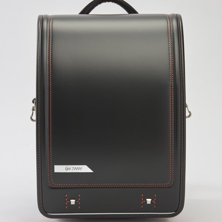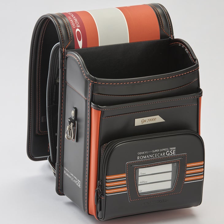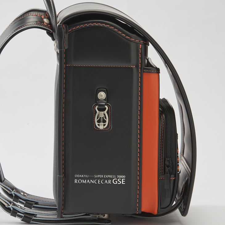 カザマではこのロマンスカーをランドセル化するにあたって、特徴的な車体色の「ローズバーミリオン」を黒いランドセルのワンポイントカラーとして中段(中マチ)に採用しました。かぶせ裏にも大胆なオレンジ系とシルバー&グレー系の配色をストライプのかたちで纏めることによりロマンスカーが優雅かつスピーディに走るイメージを表現し、オオマチと前ポケットは 車名を泊押し・素押し・反射材押し等で演出、さらにポケットの前面には かぶせ裏とのバランスを考え オレンジ他のストライプを刺繍で表現しました。