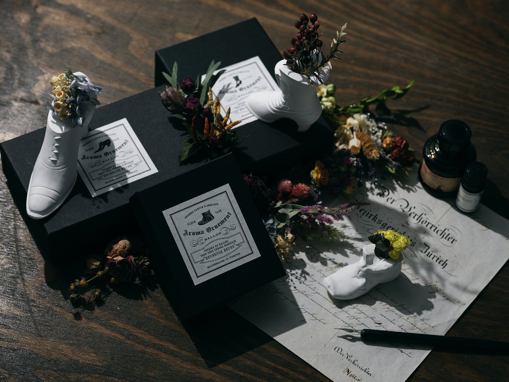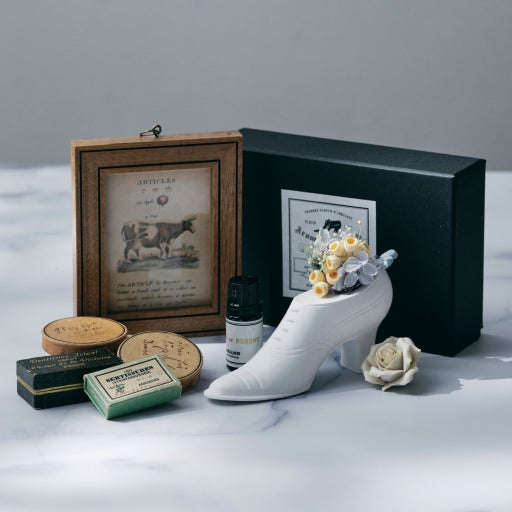 3種の靴のアロマオーナメントには、それぞれドライフラワーとプリザーブドフラワーから作られたミニブーケと、森に咲く美しい花とカシスの甘美な香りを放つ“Secret of Forest(シークレット オブ フォレスト)のフレグランスオイルが付いています。