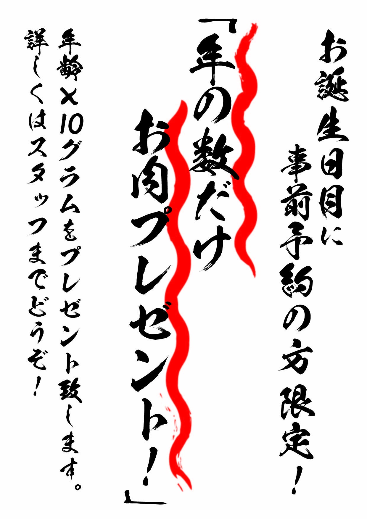 ◎ お客様の誕生月に提供の、「年齢×10gのお肉プレゼント!」が人気!