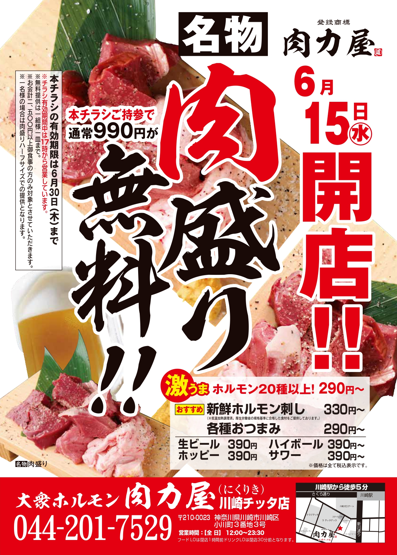 肉力屋 川崎チッタ店」のオープニング特典は、チラシご持参の方に、「名物 肉盛り」を1組様1皿無料サービス!対象期間 6月15日(水)~6月30日(木)(※該当期間は、17時~営業となっております。)