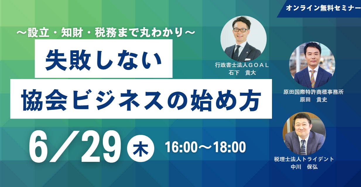行政書士法人GOAL(代表:石下貴大、所在地:東京都中央区)は、6月29日(木)に「~設立・知財・税務まで丸わかり~失敗しない協会ビジネスの始め方」オンライン無料セミナーを開催致します。