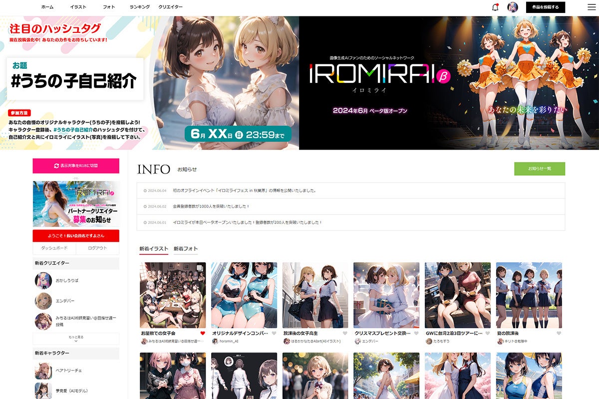 株式会社コスプレイヤーズアーカイブは、画像生成AIファンのためのソーシャルネットワーク「IROMIRAI (イロミライ)」のサービス提供を2024年6月20日より開始いたします。