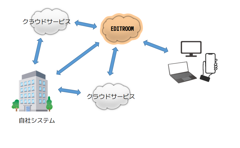 - EDITROOMはノーコード、ローコードで自社システムとインテグレートできるクラウドサービスです。
