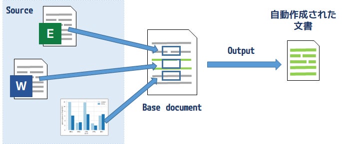 - 条件に応じて選択したExcelやWord、図などの表・文章・図を入力とし、自動で文書を組み立てることができます。