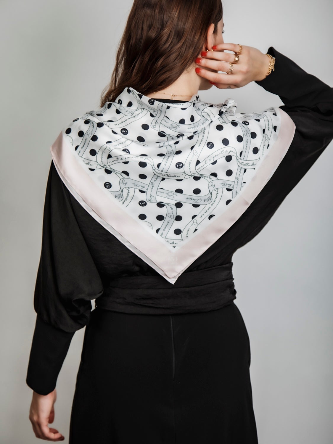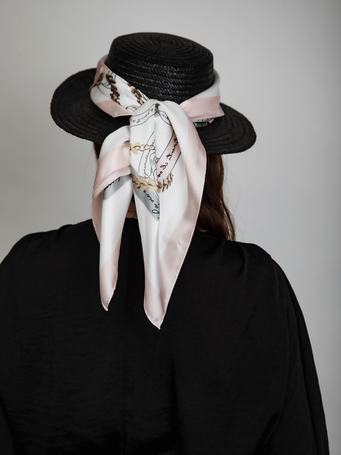 フランスの名言が散りばめられたシンプルなスカーフは、LE RUBAN 。noir / roseの2色。