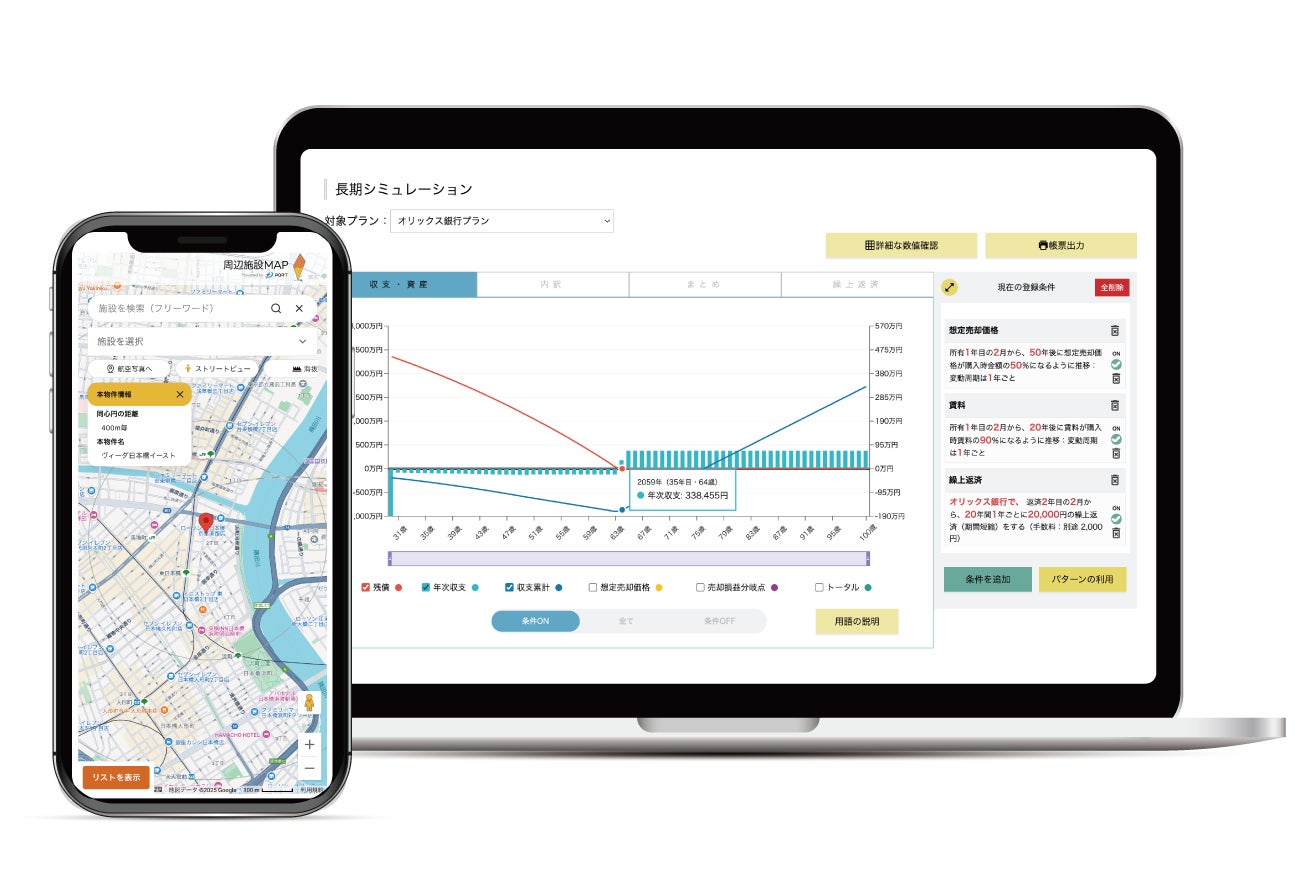 本サービスは、個人向け住宅の売買仲介を主な事業とする不動産仲介会社を対象に、不動産を販売する際に顧客に提示することを想定した資金計画や長期間にわたる収支資料などを瞬時に作成できるWebサービスで、資料作成の時間短縮や成約率の向上をサポートするものです。