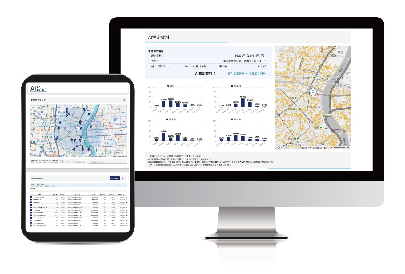 対象物件と類似性の高い取引事例などを瞬時に出力する「AIレポート」機能