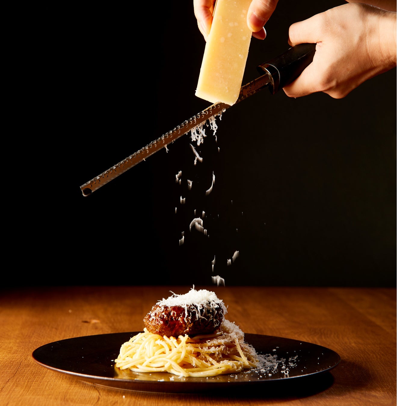 こぶし大の100%ビーフ使用の肉汁たっぷりのハンバーグをそのまま目の前で潰してつくるボロネーゼ。さらにその場で削った風味豊かなチーズをたっぷりかけてお召し上がりいただけます。見て楽しい、肉の味にこだわった肉専門店のパスタをご提供いたします。