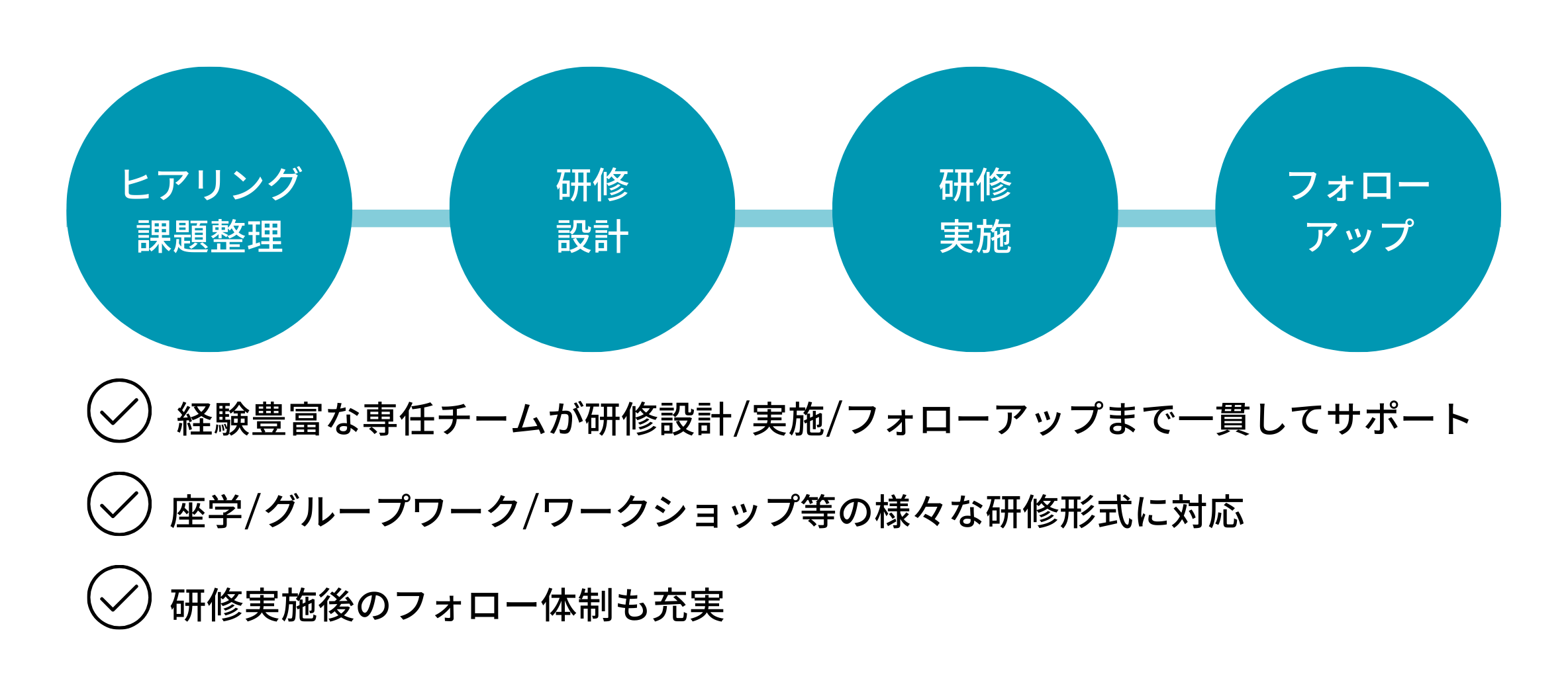 座学/グループワーク/ワークショップなどの研修方式や研修時間・回数についてもご要望に応じてご相談いただけます。また研修終了後は、受講者がより理解を深められるようフォローいたしますのでご安心ください。