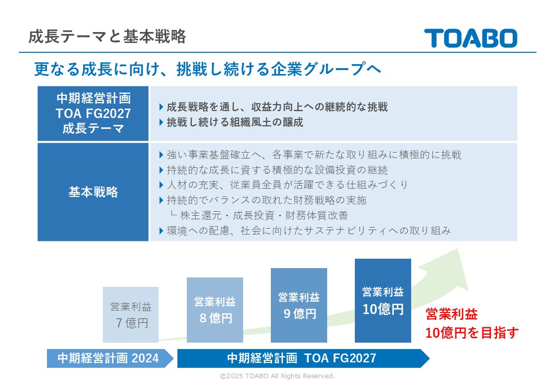 新中期経営計画「TOA FG2027」につきましては、更なる成長に向け、挑戦し続ける企業グループを目指し「収益力向上への継続的挑戦」と「挑戦し続ける組織風土の醸成」を成長テーマとして掲げております。