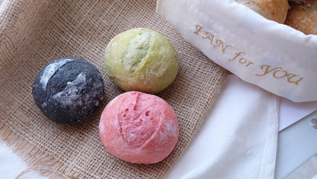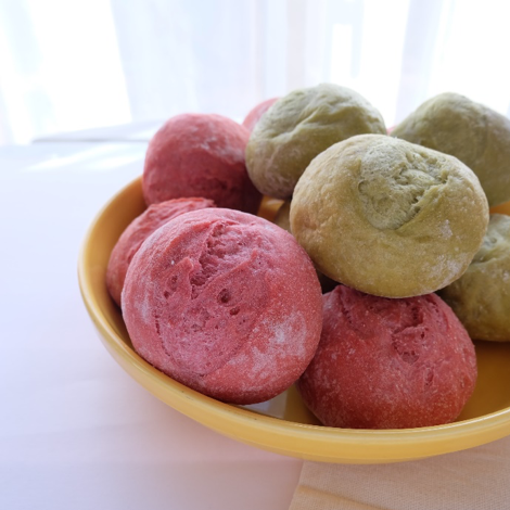 ※ピンクがビーツ、グリーンが桑茶を練り込んだパン