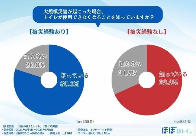 また、被災経験のない人も『知っている(68.3%)』『知らない(31.7%)』と、被災経験がある人より1割ほどは少ないですが、トイレを使用してはいけないことを知っている人が多い結果となりました。