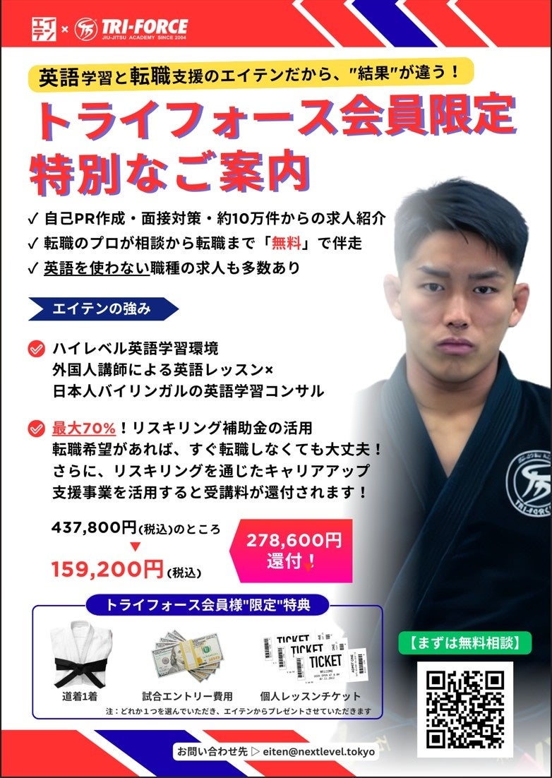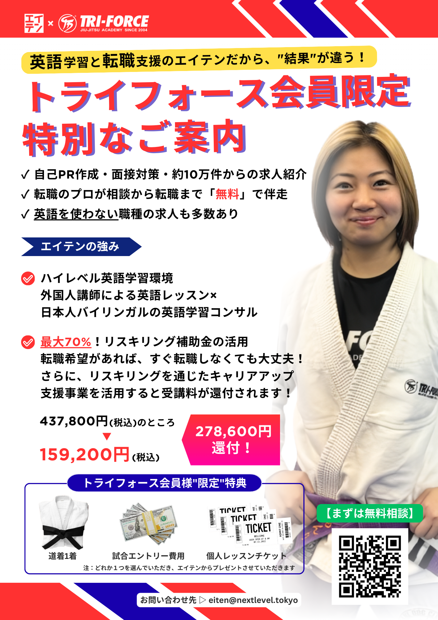 トライフォース柔術を皮切りに、格闘技を通して心身を鍛えている方のキャリアップを英語コンサルと転職コンサルがタッグを組んでキャリアップ支援を行います!