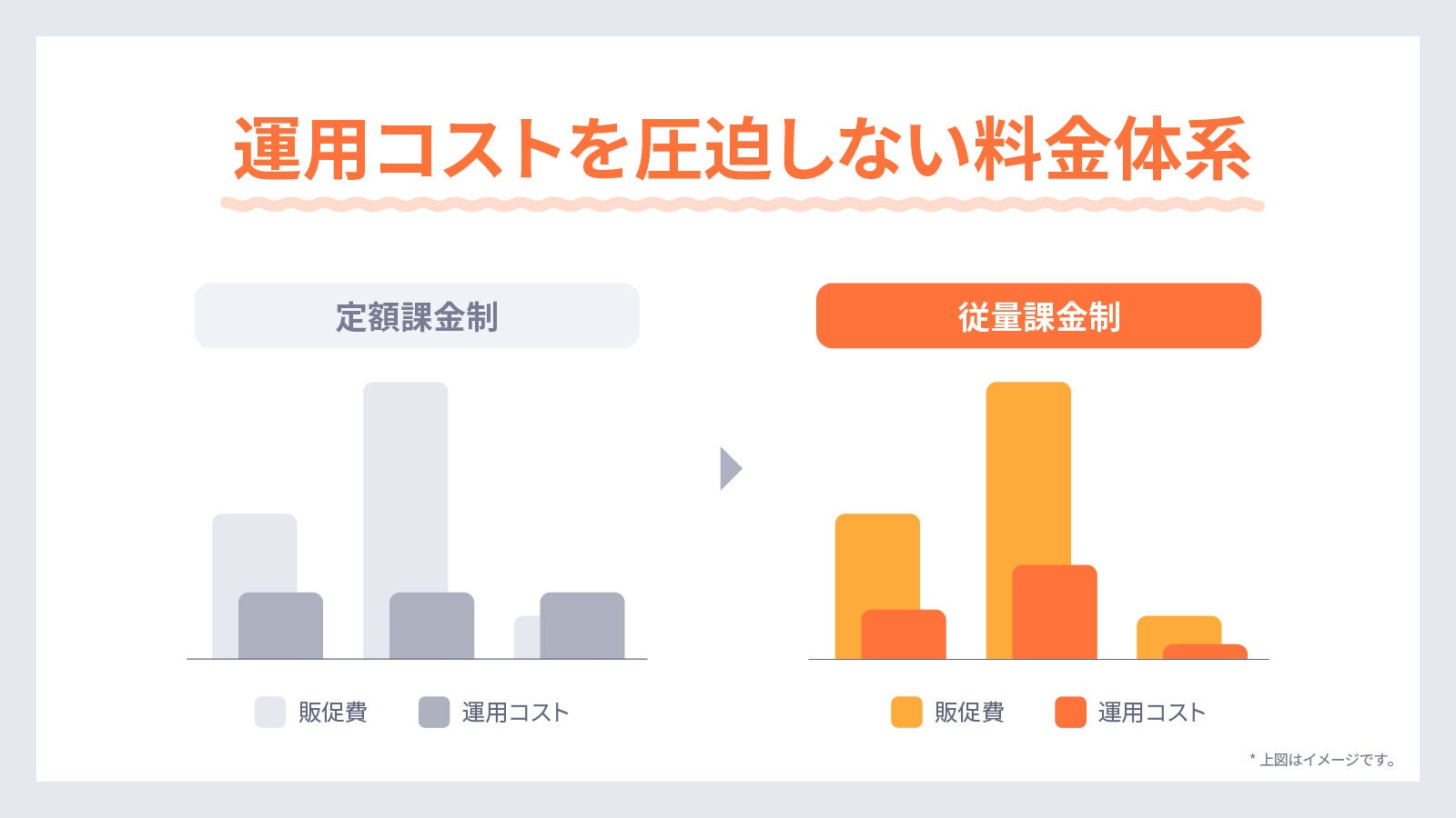 導入する商品1点ごとの初期導入費用と、閲覧された分だけしかかからない従量課金制の継続費用による料金システムを採用しています。