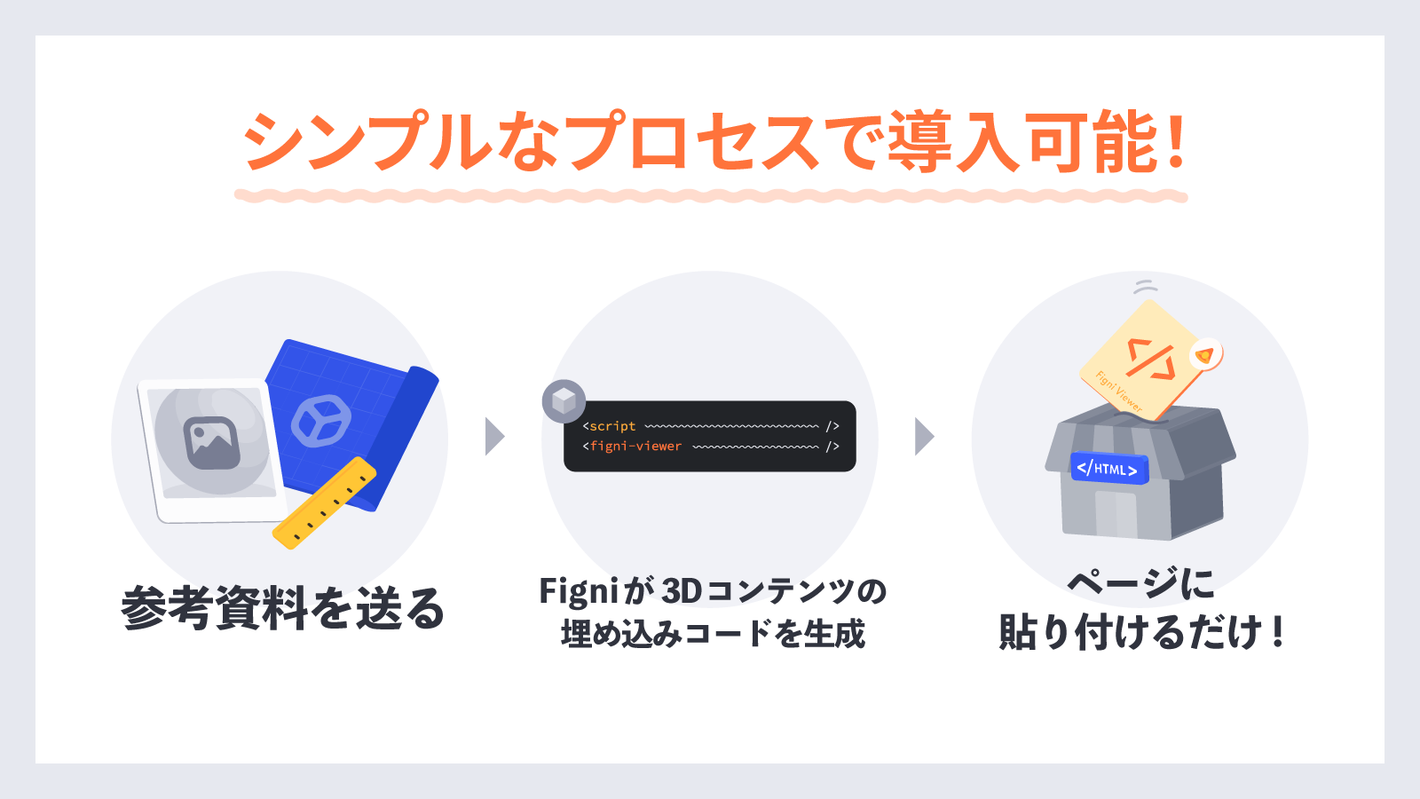 Figniでは、EC事業者様が取り扱う商品の参考資料をもとにして制作した3Dコンテンツを、あらゆるECサイトに埋め込めるコードとしてご提供することで、EC事業者は実質2ステップでECサイトに3Dを導入できるようになります。